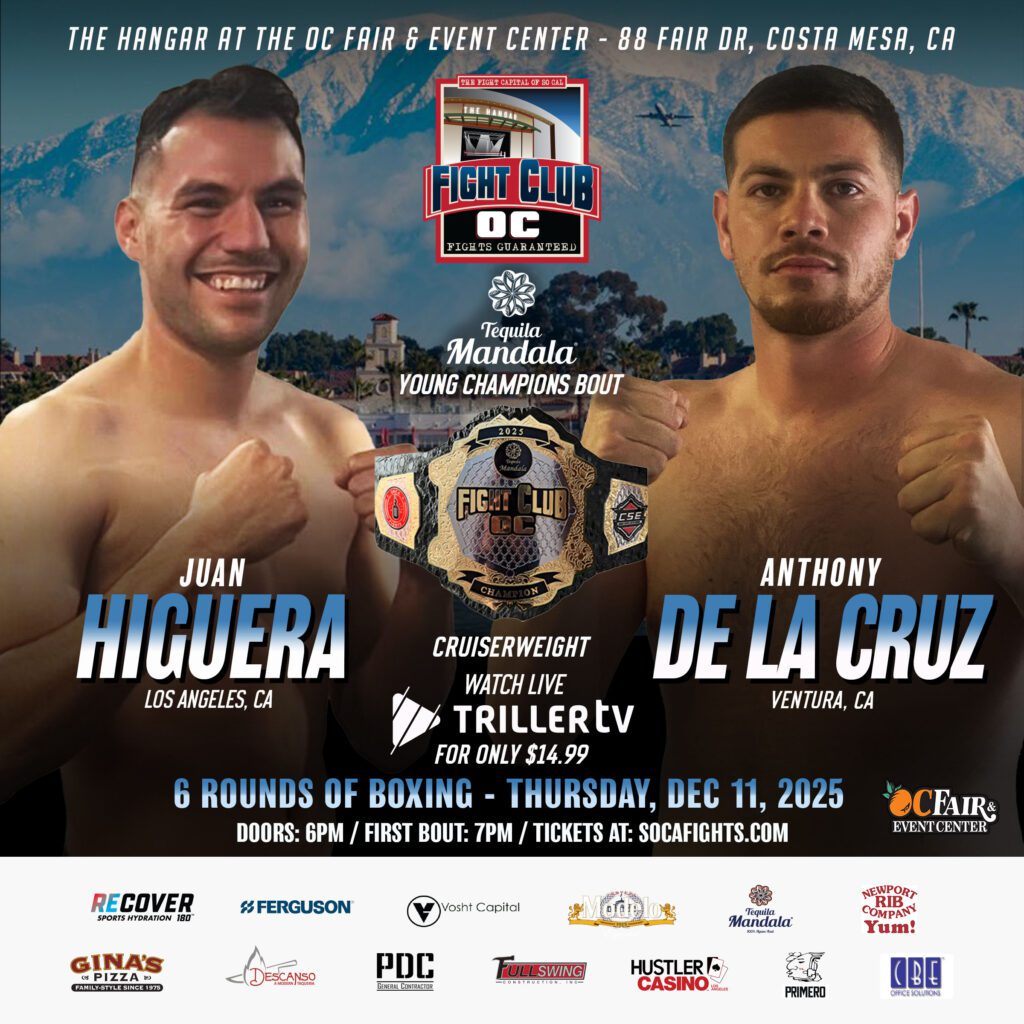 You know you have the premier club fight show in the country when some of the sport’s biggest promoters and managers place their fighters on a Fight Club OC show. It has happen almost every show for the past two years and the Thursday, December 11th Fight Club OC show in The Hangar at the OC Fair & Event Center in Costa Mesa is no exception.