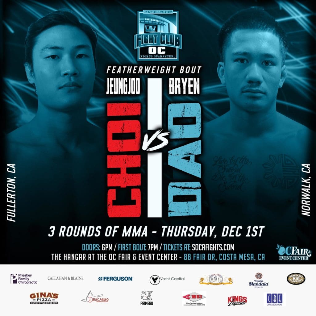 MMA fans in attendance will see the Pro Debut of Jeungjoo Choi out of Combative Submission Wrestling in Fullerton. Choi takes on Bryen Dao from Norwalk a veteran of 2 professional fights in our featured MMA bout set at 145lbs. Also fighting MMA on Dec 1st will be Lance Lee from Long Beach as he takes on Yannick Krahenbuhl from Huntington Beach, this bout is also set at 145lbs.