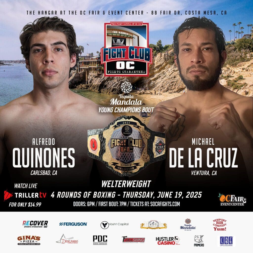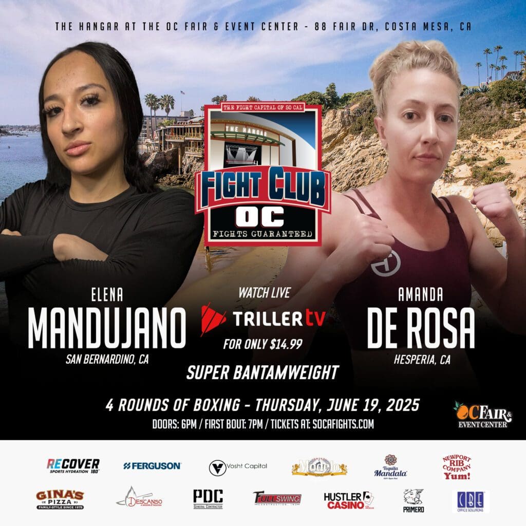 This June 19th show will feature: a great female bout between two young ladies, Elena Mandujano from San Bernardino making her pro debut vs Amanda DeRosa from Hesperia….. Boxing pro debuts for LA’s Leon “Suede The Plug” Miller Jr as he faces Albert Ochoa 1-0, Lake Forest’s Ryan Jones will also be making his boxing debut against Maclovio Salas on June 19th. In our Tequila Mandala Young Champions bout will be Alfredo Quinones 2-0-1 from Carlsbad facing Michael De La Cruz from Ventura. In MMA action El J Portee will take on 7-6 John Simon.