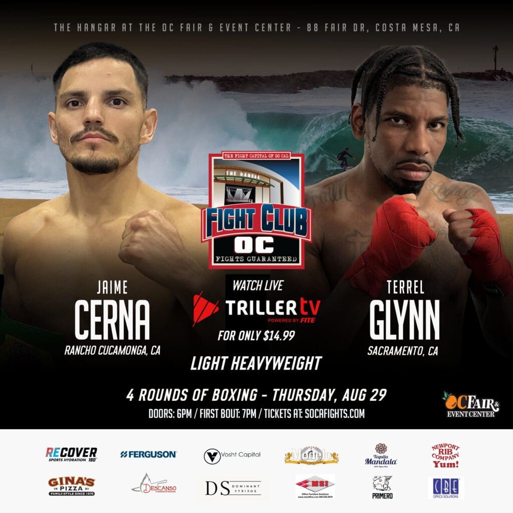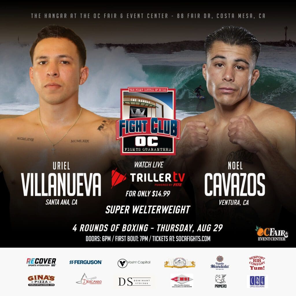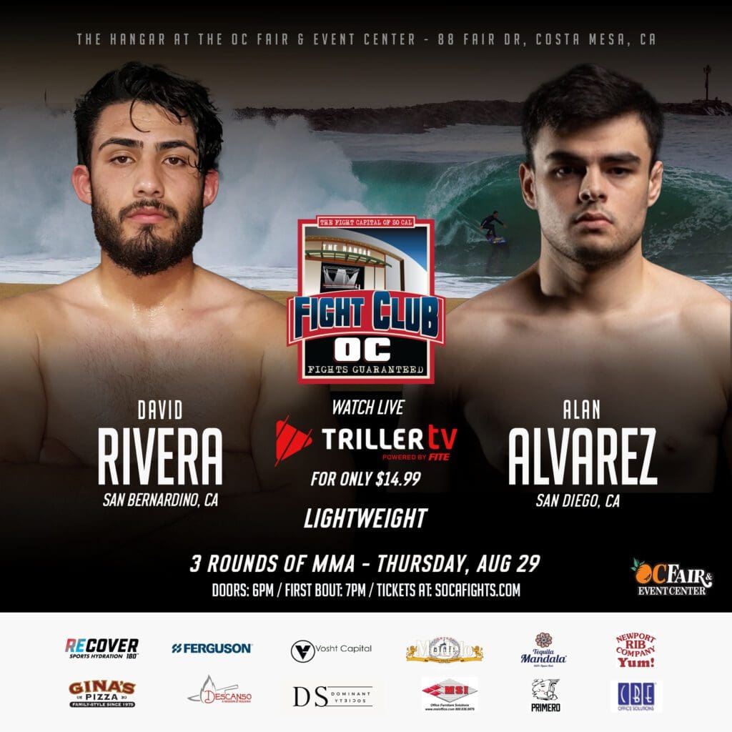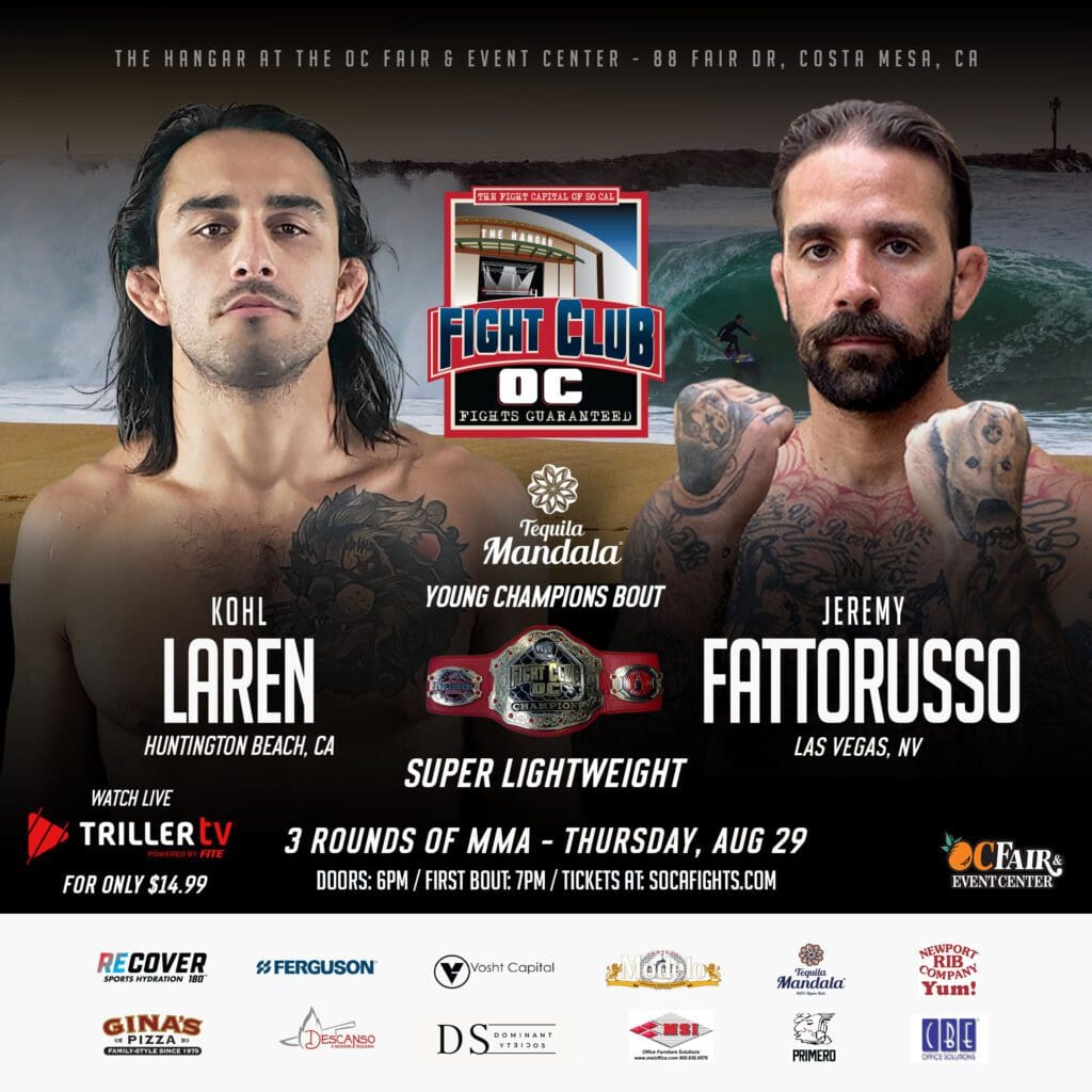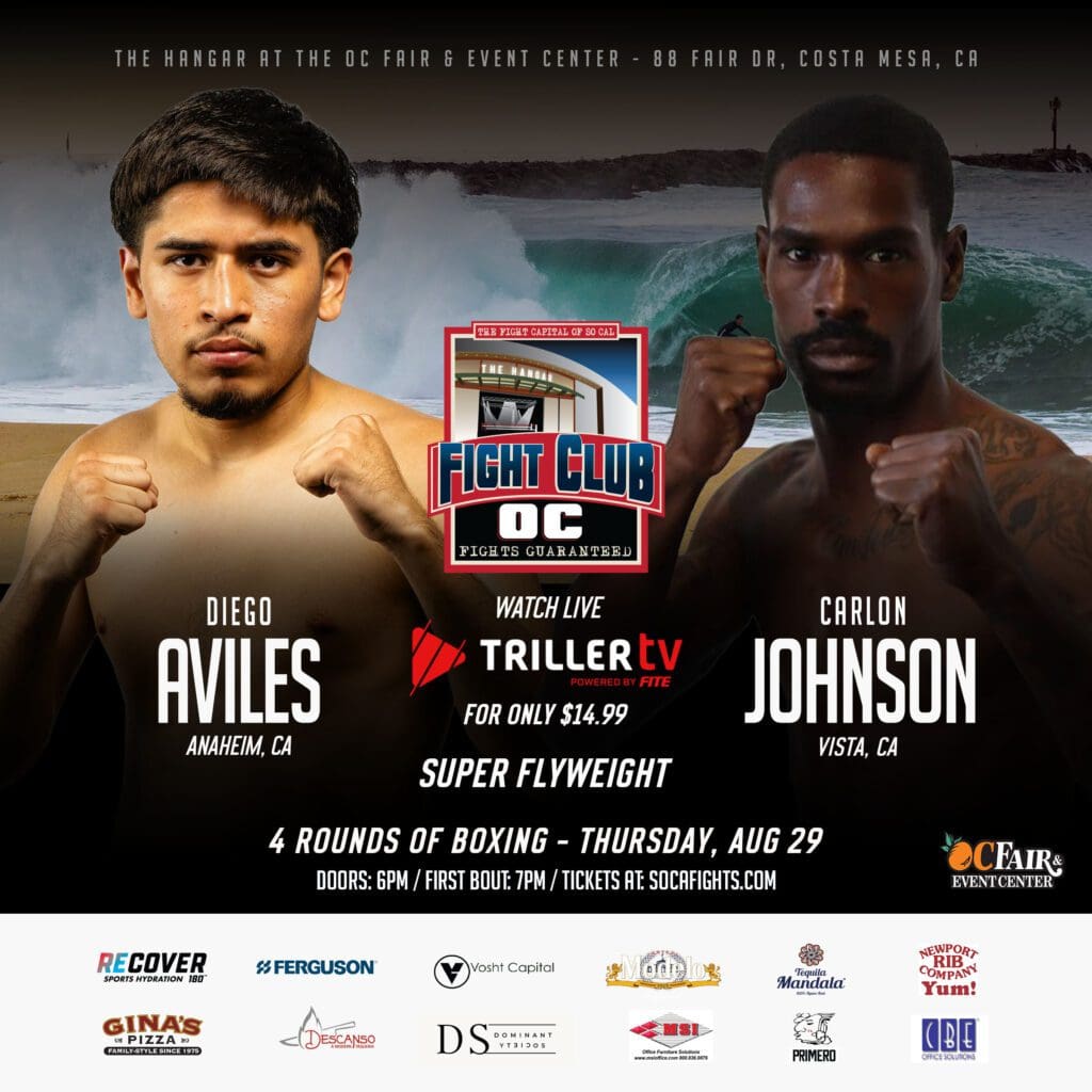 Three Orange County fighters, a BIG heavyweight bout, and two good MMA bouts are what fight fans will get at the Thursday, August 29th Fight Club OC show in The Hangar at the OC Fair & Event Center in Costa Mesa.